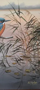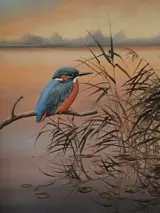 IJsvogel in de avondzon olieverf op linnendoek met houten inlijsting rondom.