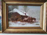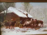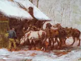 Schitterend winters landschap met paardenstal en boertje dat de paarden optuigt. Dit is een erg vroeg werk van hem en schitterend gedetailleerd geschilderd op een eiken paneel rond 1860, in deze periode werd vaker niet gesigneerd.