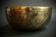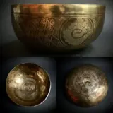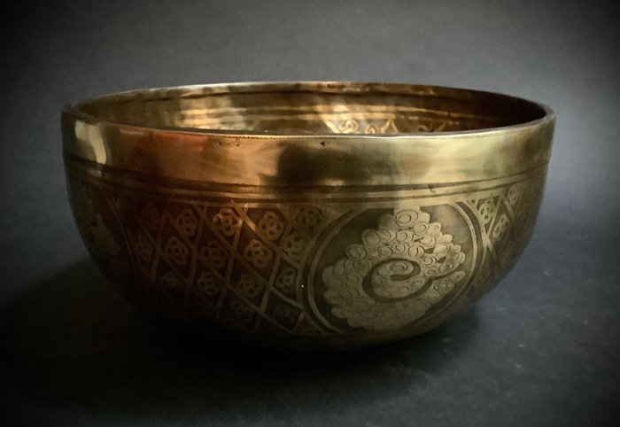 Grote klankschaal van en 24 cm doorsnede en 11 cm hoog (1490 g). De schaal is met de hand geëtst met veel details. De schaal is een samenstelling van verschillende metalen. De klank is lang en diep.