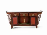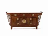 De titel zou Zitan Three-Lade Coffer LIANSANCHU, Qing Dynasty moeten zijn. Een bijgevoegd houtexpertrapport bewijst dat dit meubel gemaakt is van Pterocarpus ssp. (kin. Zitan).