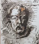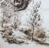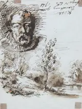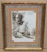 De staat van bewaring van de tekening is te zien, hij heeft enkele gaten (een op het voorhoofd van het personage en de andere kleinere onderaan).