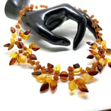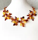 Mooie en delicate echte Baltische barnsteen bloemenketting gemaakt van met de hand gesneden bladachtige kralenornamenten in de kleuren wit, honing, cognac en kersen.