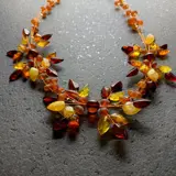 Gebruikte materialen: natuurlijke barnsteen kralen, gesneden natuurlijke barnsteen bladeren, metaaldraad, metalen sluiting.
