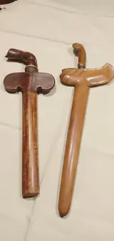 - Houten Ukiran typische gestileerde vogelvorm, zeer gebogen en hoekig, met gegraveerd messing Mendak. Houten schede met bijzondere Warangka vorm.