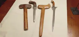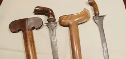- Kris van het eiland Java, eerste helft 20e eeuw: mooie kling met twee gladde randen in pamor met gebeeldhouwde en gepelde voet. Ukiran in Surakarta-stijl in houtsnijwerk; Metalen mendak. Schede zelfde houtsoort als handvat (trembalo), Warangka gayaman.