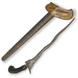 Het lemmet is fijn gegoten met een mooie patina en de schede is versierd met diverse bloemmotieven