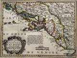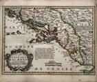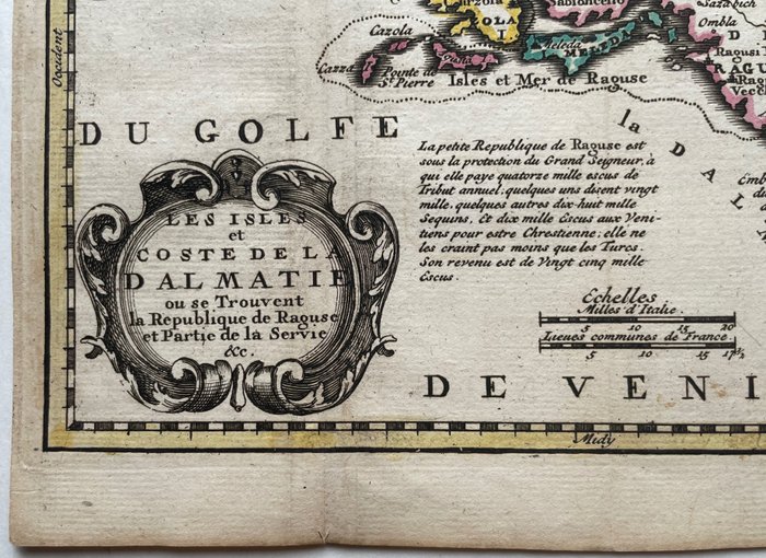 Titel in een cartouche linksonder: 'Les Isles et Coste De La Dalmatie ou se Trouvent la Republique de Raguse, et Partie de la Servie &c.'. De 'République de Raguse' en de verschillende eilanden zijn apart gekleurd.