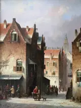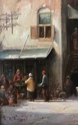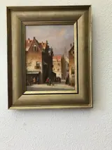 Prachtig stadsgezicht in de trant van de 19e eeuw door de Steenwijkse kunstenaar Lion Arie Feijen (1947) Deze veelzijdige kunstenaar groeide op als zoon van de schilder Leo Feyen , welke een uitgebreide klantenkring bezat in het buitenland. Lion nam deze klanten over van zijn vader en verkocht later uitsluitend particulier of via enkele galeries o.a. in Münster (D) en galerie Honingen in Nederland. Bedragen voor zijn romantische schilderijen werden vaak verkocht voor meer dan NLG 10000,-.