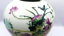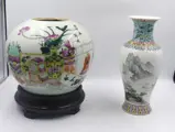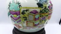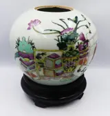Porseleinen vaas met polychroom decor van meubelen op houten voet, vroeger gemonteerd als lamp.