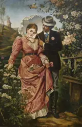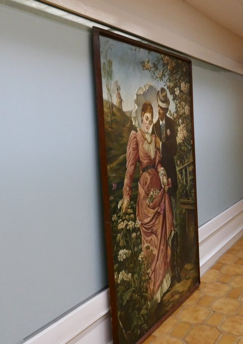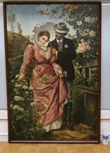 Een groot formaat olieverf op doek: een romantisch tafereel van een stel dat door het bos wandelt, terwijl de vrouw wilde bloemen plukt, haar man haar liefdevol aanschouwt terwijl hij de dame met een paraplu tegen de zon beschermt.