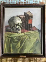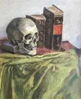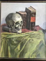 Typische maçonnieke tafel met boeken en schedel gedrapeerd in groen fluweel.