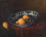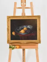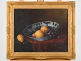 Fraai stilleven met een afbeelding van een schaal met peren en druiven, gemaakt in het begin van de 20-eeuw door de kunstenaar Meindert Krijnsen (1894-1942). Het schilderij is rechtsonder gesigneerd. Het schilderij is ingelijst.