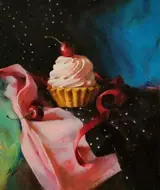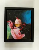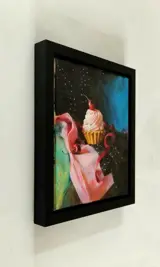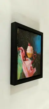 Stilleven met taartje en kersen in zwarte baklijst. Het werk is gesigneerd met N. Velikaya en van een opkomende kunstenaar uit Rusland.