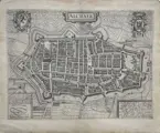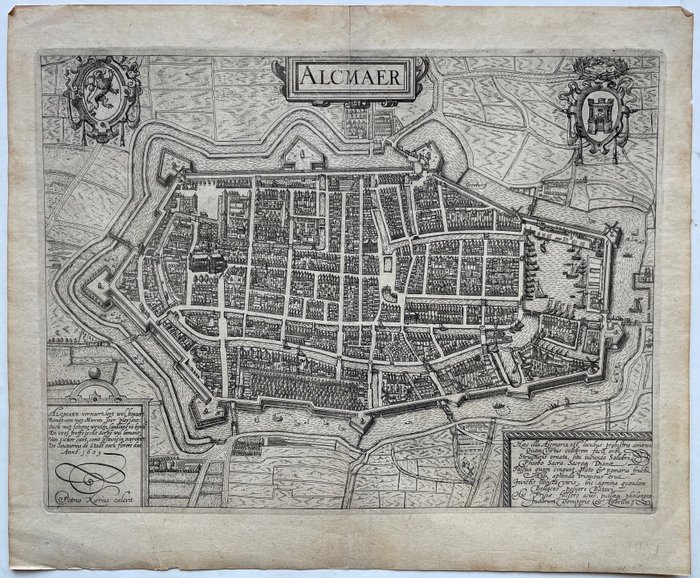 Stadsplattegrond van de stad uit vogelvluchtperspectief met de gebouwen in opstand weergegeven. Titel in een cartouche met rolwerk midden boven, links en rechts wapenschilden van Holland en de stad; linksonder een beschrijving in het Nederland, het jaartal 'Anno 1603' en de naam van de graveur: 'Petrus Kaerius caelavit', rechtsonder een beschrijving in het Latijn.