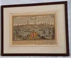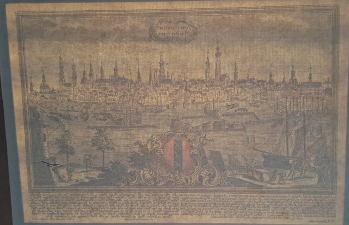 Panorama stadsgezicht Amsterdam vanaf het IJ uit de 17e-18e eeuw van 30 bezienswaardigheden met genummerde lijst van het gebouwen in het Latijn en Duits genoemd, het begint met 1. Admiralitaties et Ind. Orient. Societat. Locus, in quo funes torquentur en eindigt met 30. Porta Harlemensis.