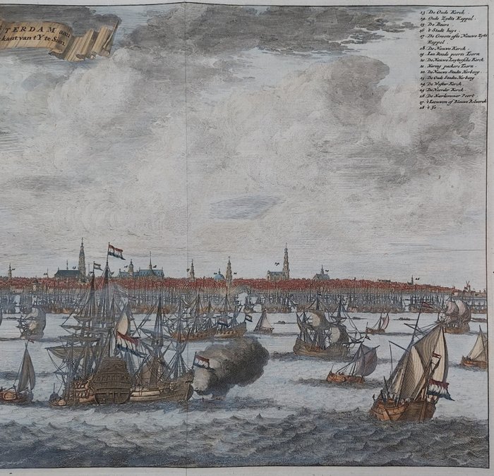 Prachtg groot panorama, met mooi zicht op Amsterdam. Veel schepen op het Ij.