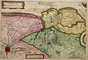 Handgekleurde kopergravure, uitgegeven in 1660 te Amsterdam door Jacob Aertsz. Colom in 'De Vyerighe Colom. Klaer vertoonende in vyftich onderscheydene curieuse caarten de XVII Nederlantsche Provincien (...).'