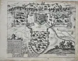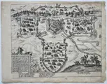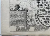 Plan van de aan alle zijden omsingelde stad en de posities van de belegeraars. Met onderschrift van 10 regels in drie kolommen in het Duits.