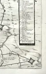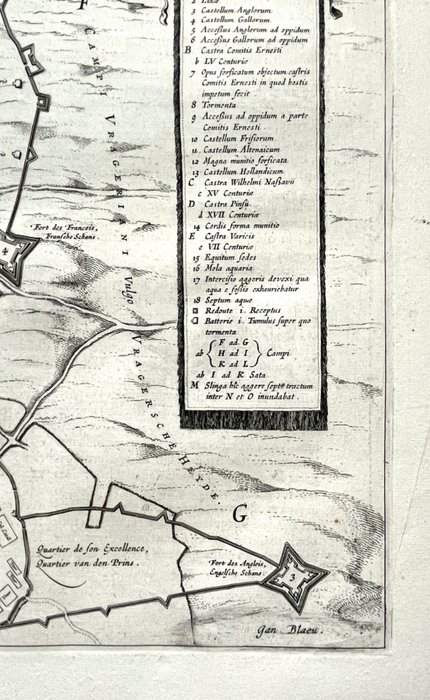 Titel in een cartouche rechtsboven: 'Grolla Obsessa et expugnata ab Illustrissimo, Friderico Henrico ... ', Daaronder legenda A-M. Rechtsonder de naam van de uitgeven: 'Jan Blaeu'.