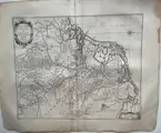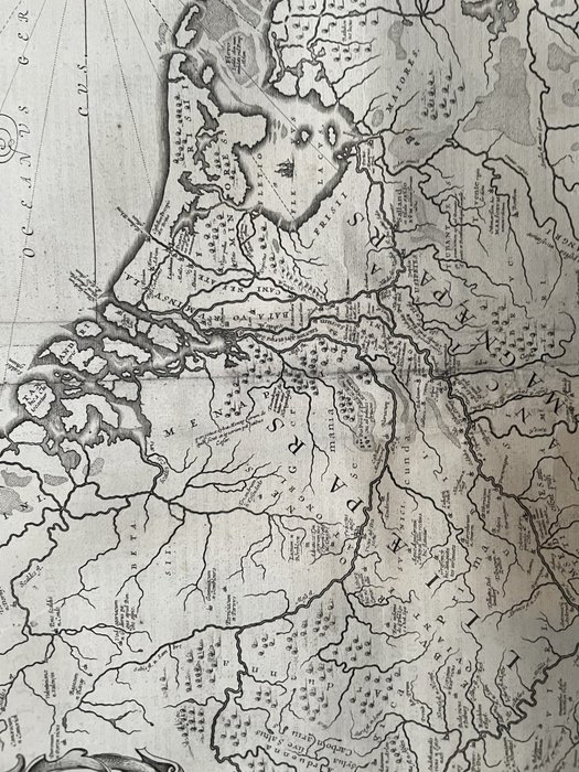 Deze kaart van Janssonius verbeeldt de Nederlanden tussen Julius Caesar en Karel de Grote en omvat geheel Nederland en een deel van Belgie. De middenvouw is aan de achterzijjde gerepareerd . Kleine vouwtjes kunnen eenvoudig gladgestoomd worden. Een goede afdruk zonder tekst- of beeldverlies. De achterzijde bevat een beschrijving van Nederlnd en Belgi in het Latijn met de stammen van de Atrebaten, Nerviërs, Menapiers, Toxandriërs etc, Het eiland Flevo wordt eveneens afgebeeld. De kaart was opgenomen in een atlas van Janssonius van 1657.