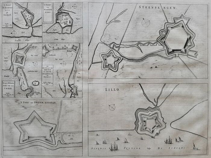 De gravure toont naast Steenbergen en Lillo nog 5 kleinere vestingplannen en fortificaties.