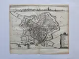Stadsplattegrond met opstanden van gebouwen en huizen. Cartouche met legenda rechtsonder. Aan de bovenzijde een aanzicht van Zutphen met Nederlandse titel bovenaan.