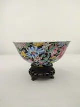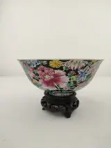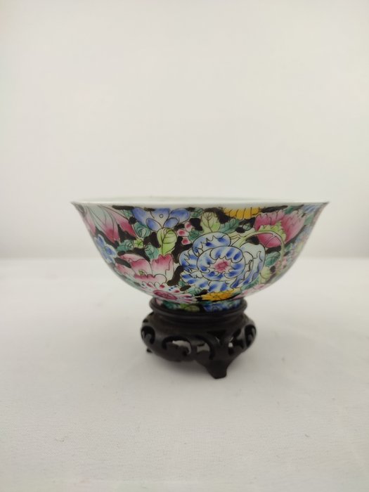 Kom van Chinees porselein, decor "Mille Fleur" op een zwarte ondergrond. Gemerkt op de basis, Republiek periode.