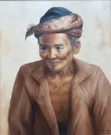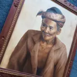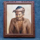 Uitzonderlijk mooi olie op doek schilderij van een oude indonesische wijze man in prachtigehouten lijst, handgesigneerd TokoMullana 1980.