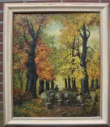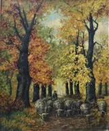Prachtig tafereel van een herder die zijn kusse over een boslaan in herfsttinten leidt.