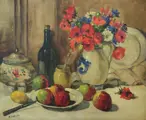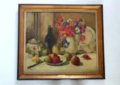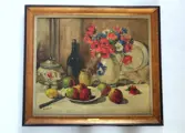 Impressionistisch oud stilleven met appels, bloemen en fles wijn van P. Lanou in luxe lijst.