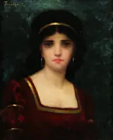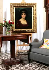 Schitterend en mooi portret van een vrouw met een symbolistische dimensie. Het belangrijke clair-obscur van dit schilderij weerspiegelt de oriëntalistische en mysterieuze vrouwen die Trouillebert in de jaren 1870-80 schilderde. De catalogi van Parijse Salons vermelden gelijkaardige onderwerpen (in 1874 La bediende du Harem, in 1881 La Charmeuse, in 1883 Ariane en in 1884 La captive). Merk op dat het schilderij van de Salon van 1874 zich nu in het Museum voor Schone Kunsten in Nice bevindt en hetzelfde gezicht heeft als de vrouw op ons schilderij (wat een tijdsvergelijking mogelijk maakt).