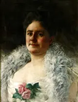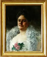 Interessant olieverfschilderij op canvas van goede kwaliteit, voorstellende een portret van een vrouw, gemaakt door de getalenteerde Franse schilder actief tussen het einde van de 19e en het begin van de 20e eeuw, Paul François Quinsac (Bordeux, Frankrijk, 1858 - 1929). Het werk, gesigneerd en gedateerd, toont een vrouw van middelbare leeftijd gezien vanaf het middel en in driekwartaanzicht met een rijke en zeer getailleerde jurk, gemaakt van lichtgekleurde stof met twee rozen op haar borst, gedragen met nonchalante elegantie. Met evenveel minachting katalyseert het gezicht de aandacht van de kijker, vasthoudend aan de precieze canons van schoonheid van die periode - van de Franse school van het begin van de twintigste eeuw - zoals blijkt uit de levendige blik van de zwarte ogen en het zwarte haar gestileerd in een elegante en goed samengestelde manier. Het portret illustreert - naar alle waarschijnlijkheid - een edelvrouw uit de high society, afgebeeld met een elegante en gezaghebbende houding, typerend voor portretten van belangrijke onderwerpen uit die periode, vooral tussen het einde van de 19e eeuw en het begin van de 20e eeuw.