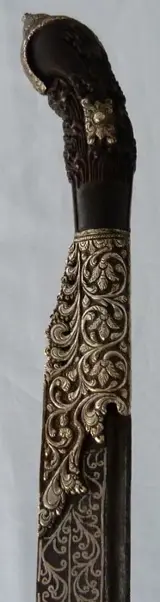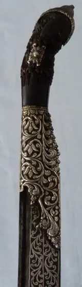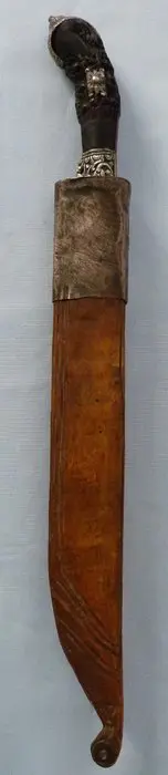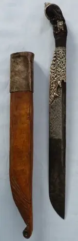 Een groot 19e-eeuws Sri-Lankaans Pia Ketta-mes - met uitgebreide massief zilveren decoratie op het hardhouten handvat en het forte van het lemmet. Compleet met originele houten schede die aan de basis is gedraaid waardoor het mes toegankelijk is - ongebruikelijke opstelling maar lijkt eigentijds met het mes. Lemmetlengte is 23 cm (31,75 cm in totaal).