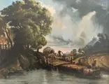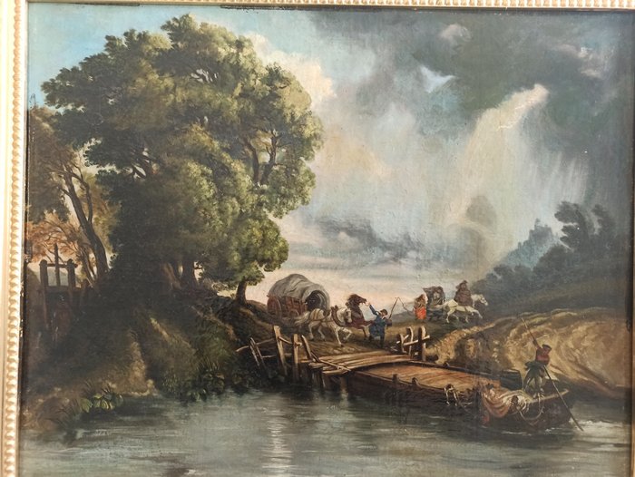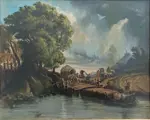 Dit wordt geleid door een koetsier, die echter is afgestegen, om te proberen de twee paarden te temmengesleept. De strijdwagen staat namelijk op het punt op een vlot te stappen, dat hem naar de kust zou moeten brengentegenover de rivier. De paarden lijken echter bang bij het zien van de stroom, en dat lijken ze niet te zijnde bevelen van hun gids willen opvolgen. Verderop is een groep reizigers, van wie er één een isop zijn beurt te paard, dat wegtrekt en waarschijnlijk over zijn eigen rivier is vervoerd