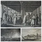 Drie prenten met verschillende scènes op Polynesische eilanden en Nieuw-Zeeland bezocht door kapitein James Cook: Ulietea (Raiatea) - Genootschapseilanden; Santa Christina (Tahuata) - Marquesaseilanden; Cook Strait tussen het noordelijke en zuidelijke eiland - Aotearoa / Nieuw-Zeeland.