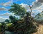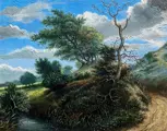 Eigentijdse impressie naar het bekende schilderij van een duinlandschap van Jacob van Ruisdael (ca. 1628-1682).