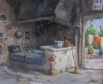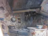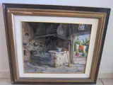 door de meester Raffaele Lopez (1921-1995) interieur van een boerderij olieverf op paneel totale maat 62x72 binnenmaat 40x50 De lijst is vrij en heeft krassen zoals op de foto te zien is.