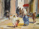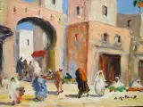 Het vertegenwoordigt, zoals vaak bij de oriëntalistische schilder, een gezicht op Marokko.
