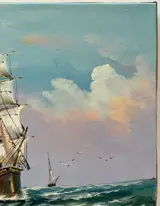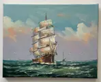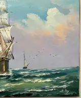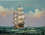 Klassieke techniek met prachtige goed beheerste vlakke gebieden die een boot van het type Caravelle in open zee voorstellen
