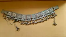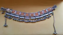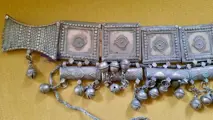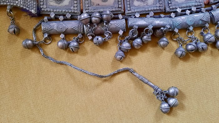 Jemenitische gearticuleerde riem (waarschijnlijk in zilveren alliantie?) bestaande uit 10 vierkante platen (6X6) met aangebrachte versiering van ruitjes met kralenrozetten erin; de riem is gemonteerd op een strook roze stof, 10 "HIRZ" amuletten of gebedscilinder verlengen de platen, een grote sluiting eindigt aan weerszijden van de platen.