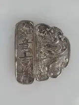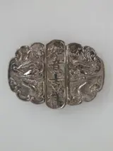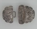 Chinees zilveren riemgesp versierd met twee draken en een inscriptie in het midden.