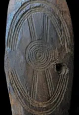Carved intricately with clan designs on one side.