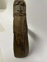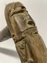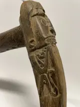 West-Papoea Geelvinckbaai - sago ponder met fijn uitgesneden korwar figuur - restanten van kasuarisveren bovenop kop - hoogstwaarschijnlijk eerder ritueel werktuig dan werktuig