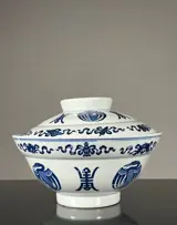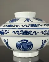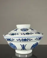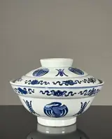 Een grote blauw-witte stoomschaal met deksel.
