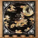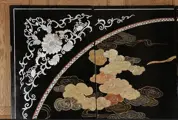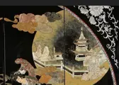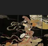 Aziatisch gelakt en ingelegd kamerscherm met vier panelen. Elk paneel is 16 "breed. Ik geloof dat de bevestiging/bevestigingen zijn vervangen en niet origineel zijn. Daarnaast moet een van de bevestigingen worden vervangen