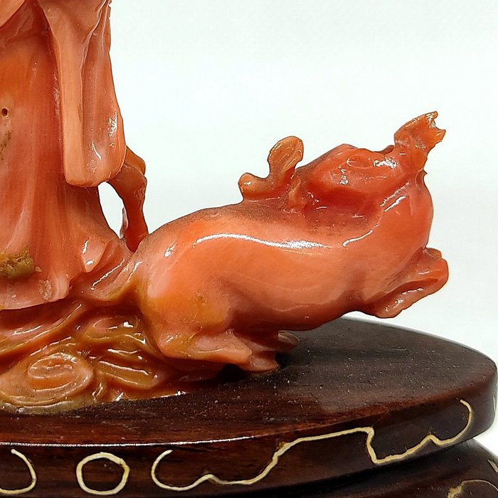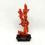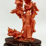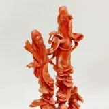 Koraalsculptuur met afbeelding van "Fu Lu Shou" (福禄寿), bevestigd op een speciaal op maat gemaakte houten voet met zilveren inleg.