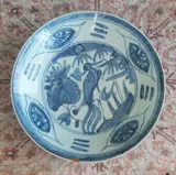 Onze schaal pronkt met een "nobele restauratie" van een kleine chip aan de rand met fijn goud - Kintsugi 金継ぎ (gouden verbinding). (Zie close-up foto's 13 1 21).