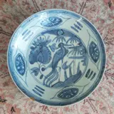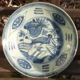 OUDE MING ronde schaal ("Charger") in porselein steengoed uit China. Blauw-witte decoratie met in het midden een feniks op een achtergrond van een landschap met bamboe en pioenrozen, de vleugel, begrensd door vier blauwe cirkels, vier reservaten met florale decoratie en een Griekse rand. In tegenstelling tot wrakstukken uit deze periode profiteert ons gerecht van een intact, dik en zeer glanzend glazuur.