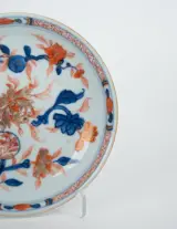 Een prachtig antiek Chinees porseleinen bord met een centrale decoratie van een landschap in granaatappel, lotus en perziken, uitgevoerd in een mooi onderglazuur blauw en wit met bovenglazuur bovenglazuur rood en goud. In de border een klassieke versiering van repetitieve bloemenpanelen. Handgemaakt in het oude China tijdens de Qing-dynastie, Yongzheng-periode (ca. 1720-1735). Gegarandeerd origineel en van de aangegeven periode, met typische bruine mokka geglazuurde rand.