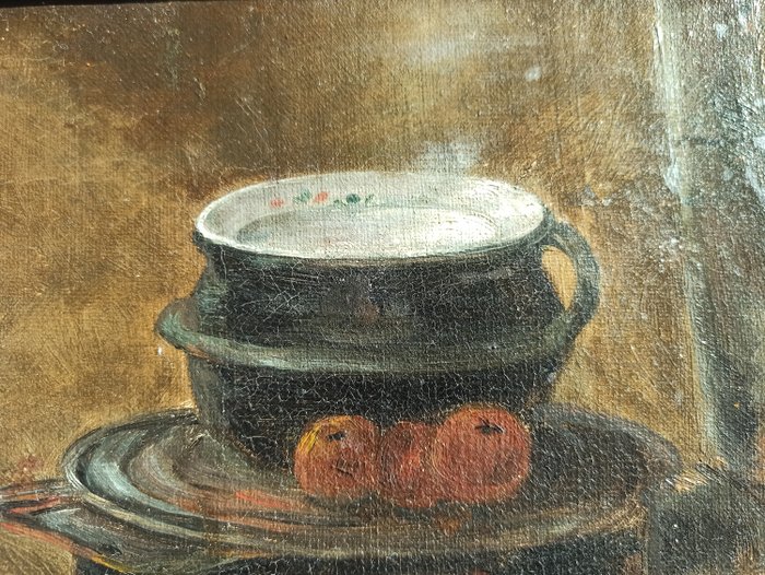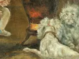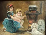 Olieverf op doek van een 19e-eeuwse schilder, voorstellende twee kinderen en twee witte honden die zich opwarmen voor een brandende kachel.